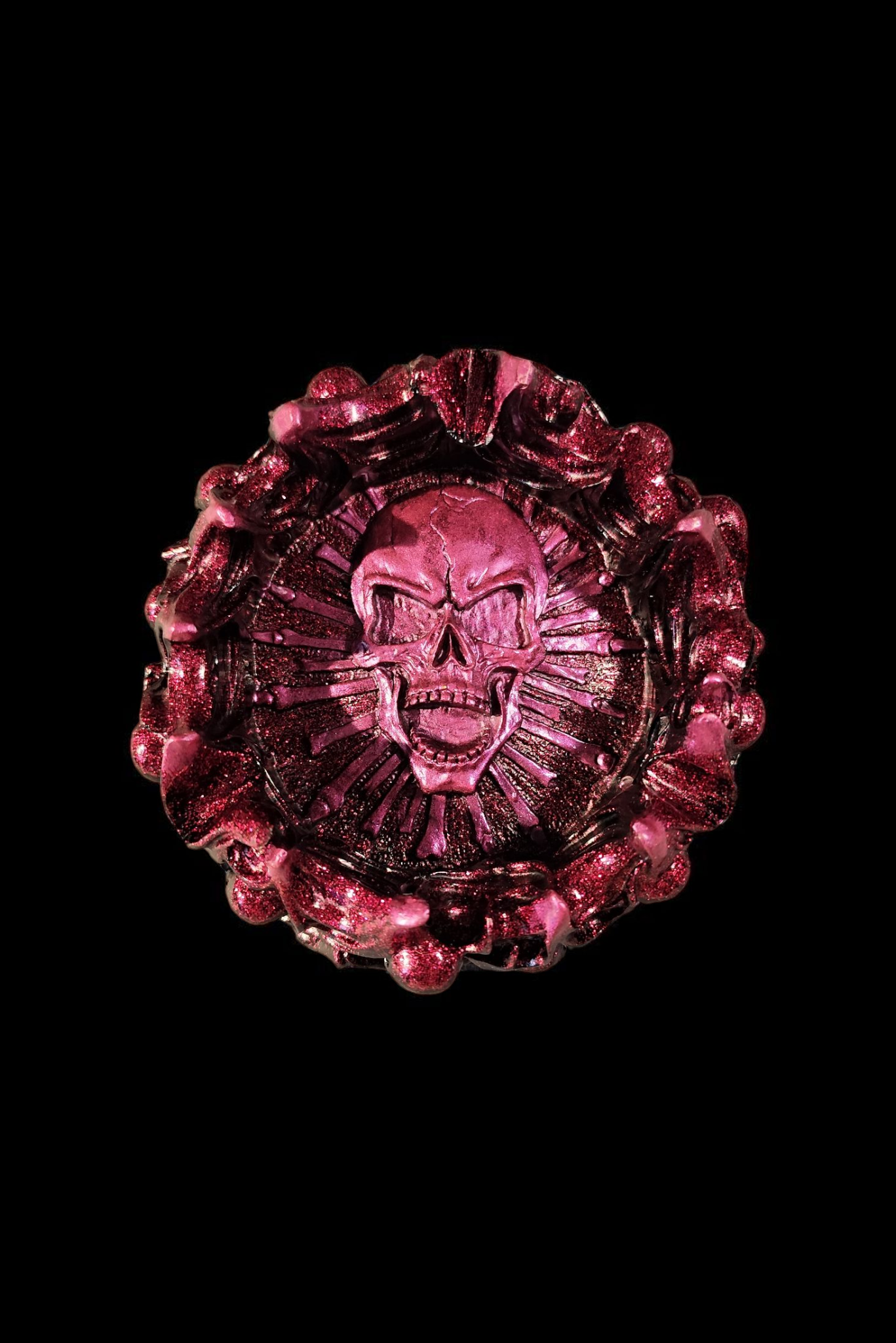Enhance your smoking accessories collection with our unique skull ashtray . Crafted from high-quality epoxy resin and embellished with pigments and gold leaf or glitter , this ashtray adds a touch of gothic elegance to any room. Its intricate skull design is perfect for those who appreciate macabre decor. While no resin is completely fireproof, our ashtray is designed for durability and style. Please note that due to the complex manufacturing process, minor bubbles may appear on the sides or in small corners.