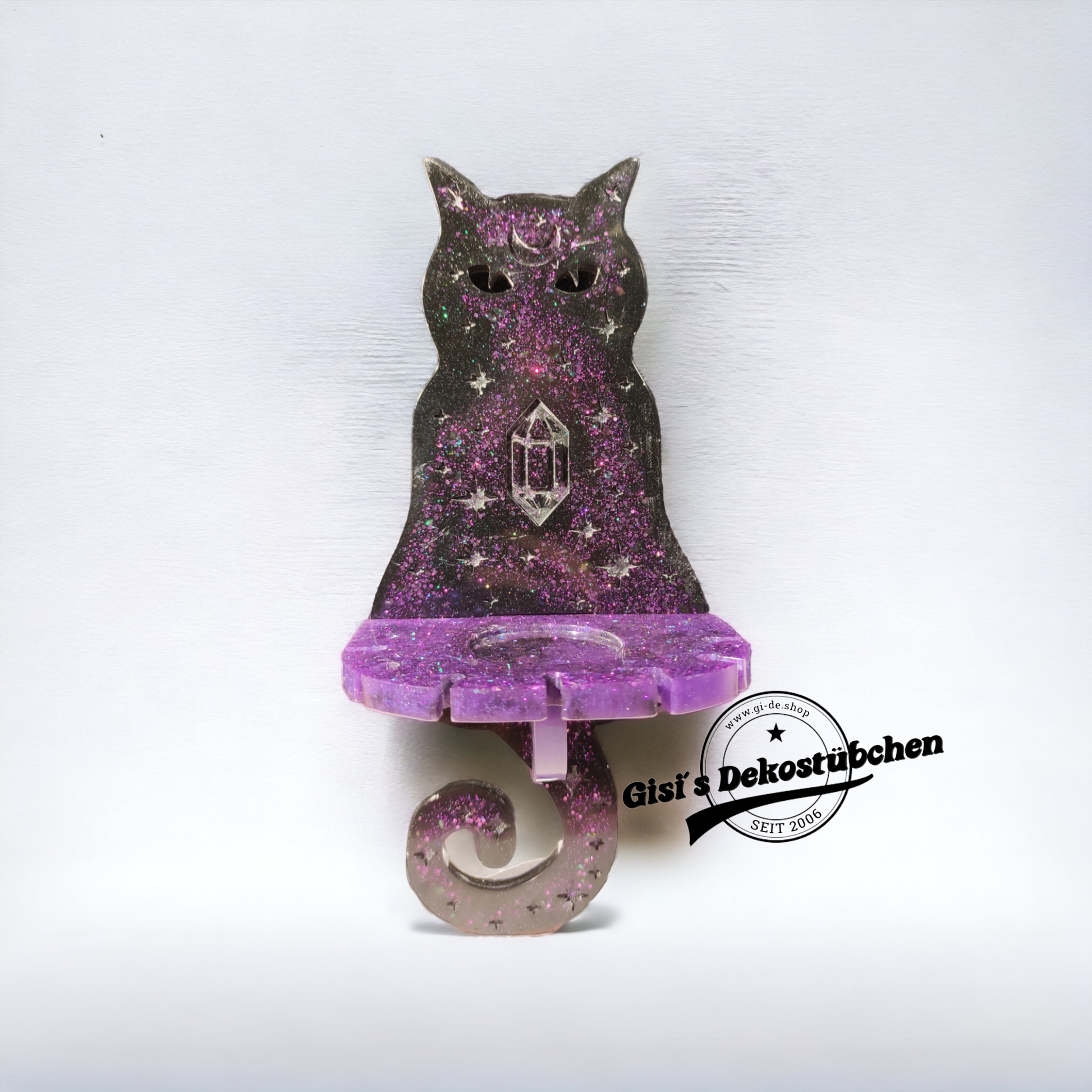 The first picture shows the cat, for example, in black/purple with purple glitter.